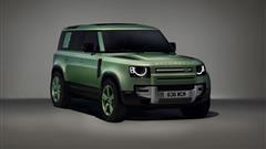 The "75 Years" graphics, privacy glass, and Ceres Silver bumpers complete the special Land Rover Defender's exterior changes.