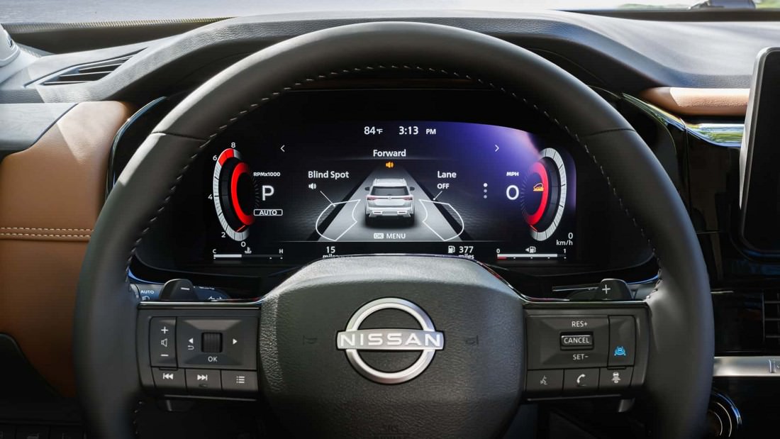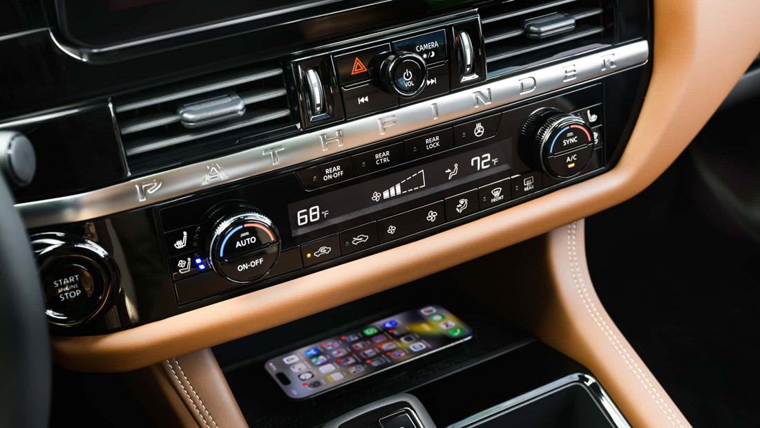 Across all trims, every 2026 Pathfinder now includes a standard 12.3-inch central touchscreen equipped with wireless Apple CarPlay and Android Auto. Buyers who opt for the SL or higher trims will also receive a matching 12.3-inch fully digital instrument cluster. Nissan has enhanced the wireless charging pad as well, introducing a cooling system, magnetic alignment for more secure phone placement, and an increased power output—rising from 5 watts to 15 watts. Upper trims such as the Rock Creek, SL, and Platinum models now come with a high-definition overhead camera system. Returning for 2026 is the “invisible hood” technology, which displays a view that simulates seeing through the hood and engine bay—especially useful for Rock Creek drivers tackling off-road terrain where visibility is limited.
