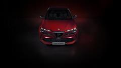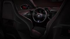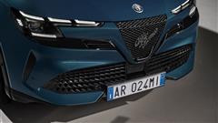 The front fascia features elongated matrix LED headlights, interconnected with slim intakes via dark trim, lending it a dynamic appearance. The introduction of the new scudetto grille, partially covered in the fully electric version, symbolizes the brand's transition into a new era. Inspired by the Quadrifoglio variants of the Giulia and Stelvio, the front bumper integrates large intakes and a splitter for a sporty flair.