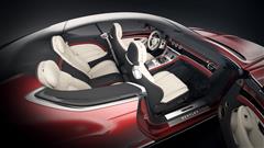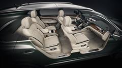 There are four seats in the interior, and the upholstery is made of a combination of Portland and Cumbrian Green skins with subtle contrast stitching and a suit and bow tie design embroidered into the headrests.