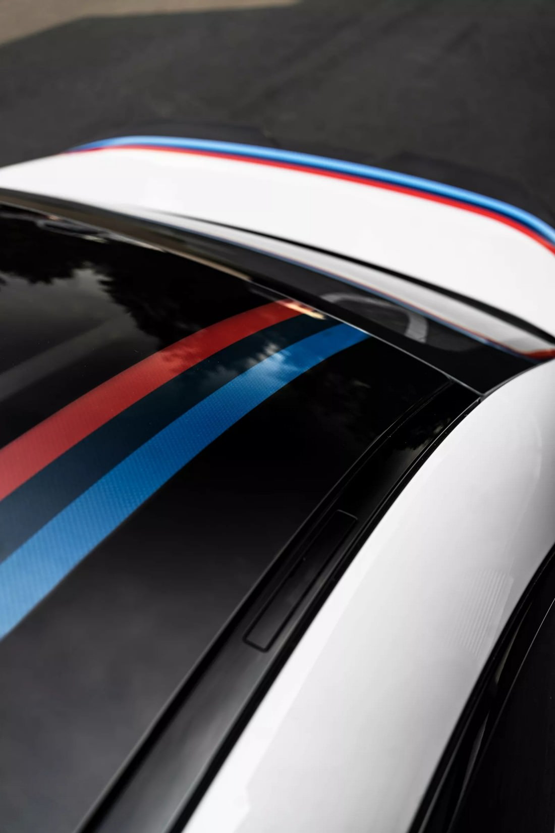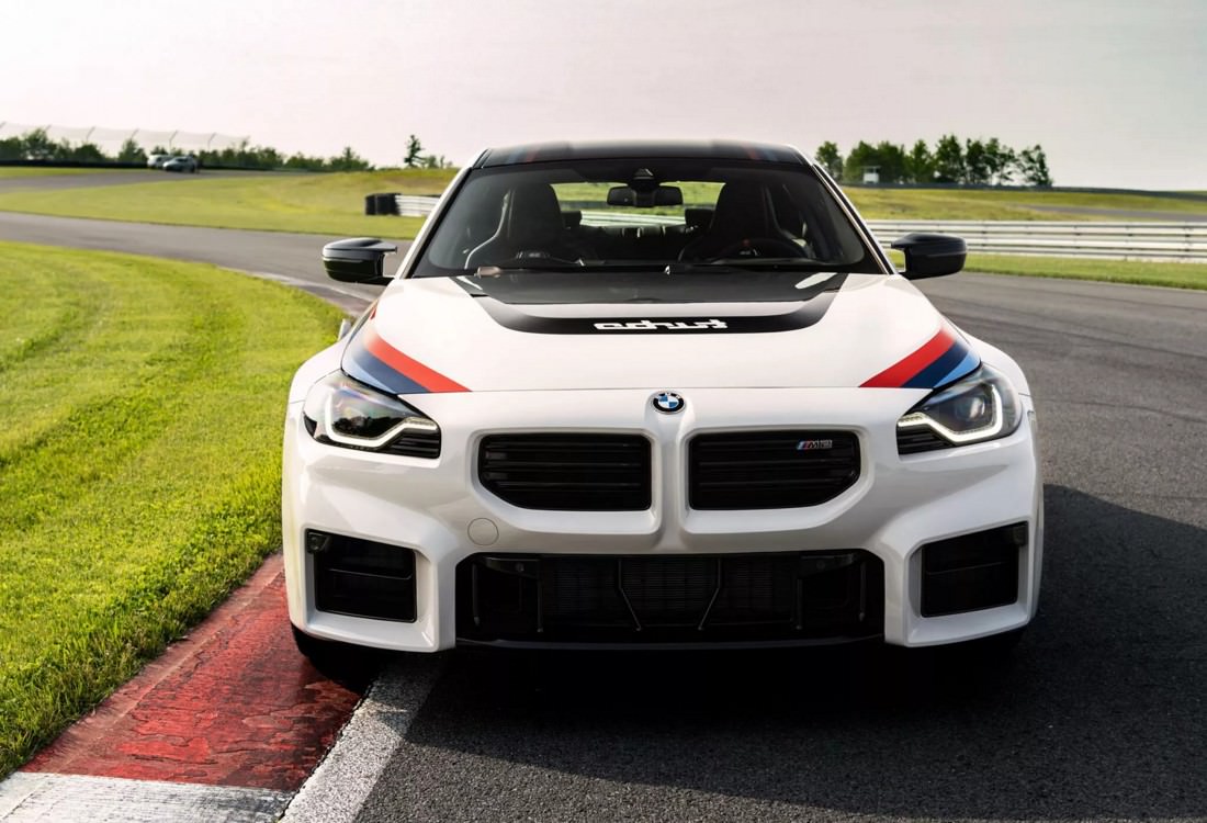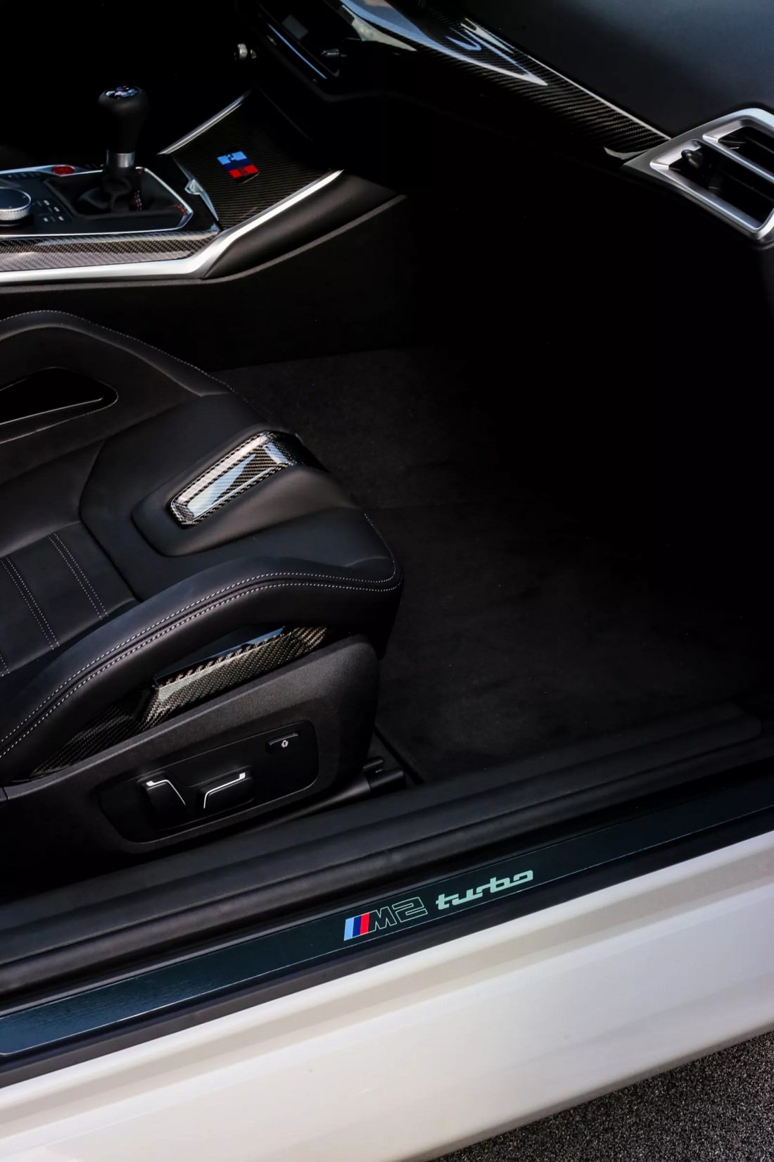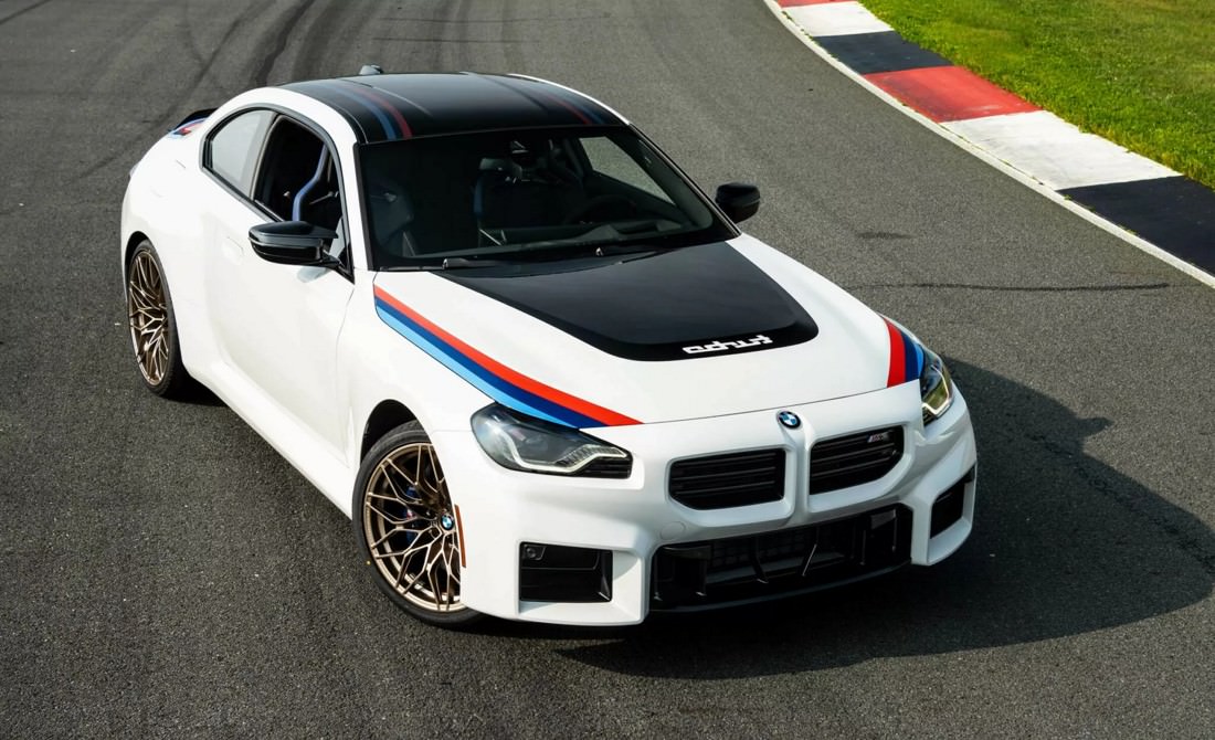 Visually, the new M2 Turbo Design Edition is a clear nod to the past. Every unit comes finished in Alpine White, just like the original 2002 Turbo, and features a carbon fiber roof that includes signature M-colored stripes running from front to back. While the carbon roof itself is already a $2,600 option on the standard M2, this version’s hand-painted detailing gives it a unique, artisanal touch. Additional M stripes adorn the hood and trunk, reinforcing its motorsport DNA. One particularly charming detail is the reversed “Turbo” script on the hood — a clever tribute to the original 2002 Turbo’s mirrored lettering that was meant to startle drivers in their rear-view mirrors. Though it doesn’t feature the classic side “hockey-stick” stripes of its ancestor, the design remains faithful to BMW’s 1970s performance aesthetic.
