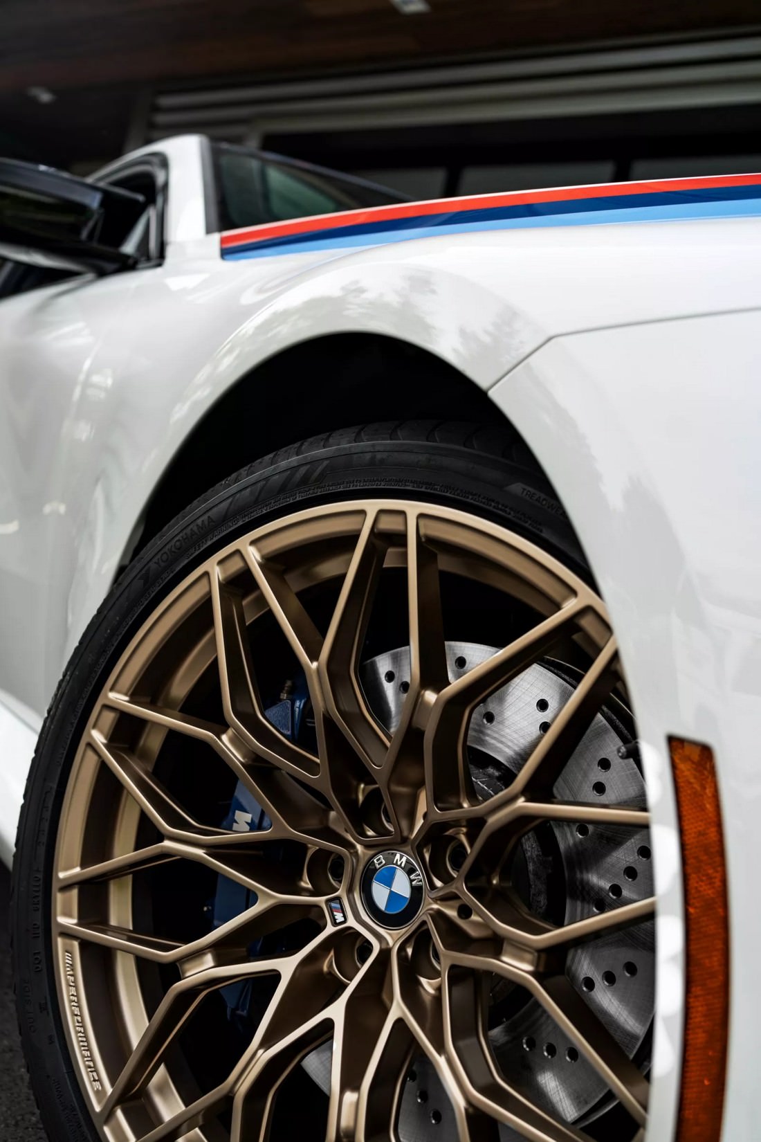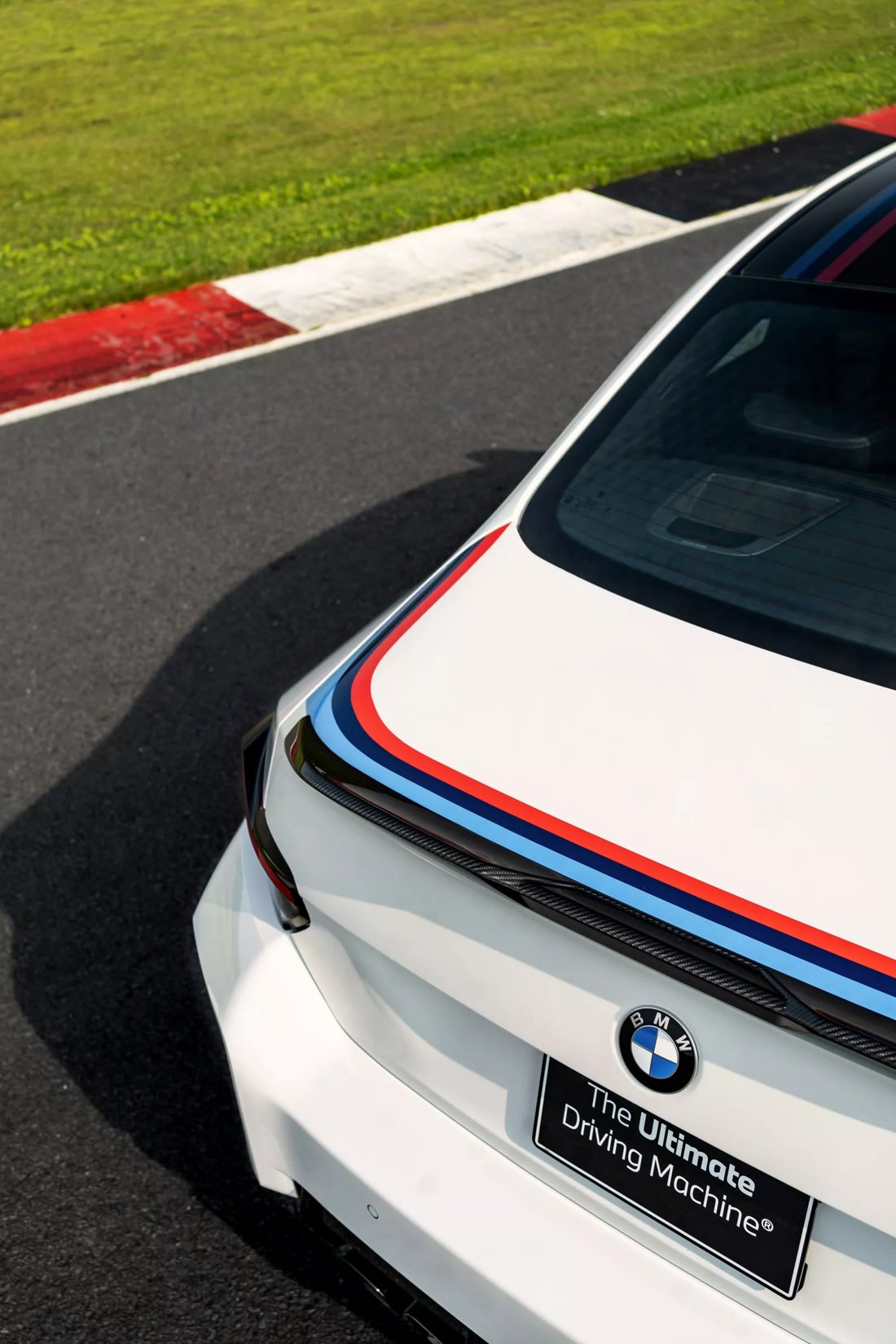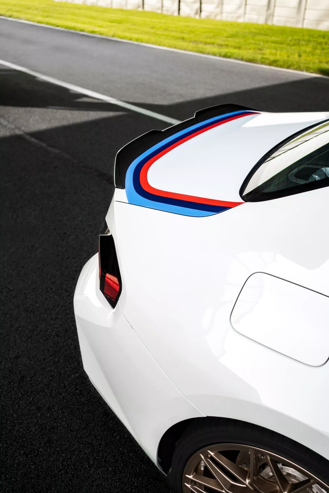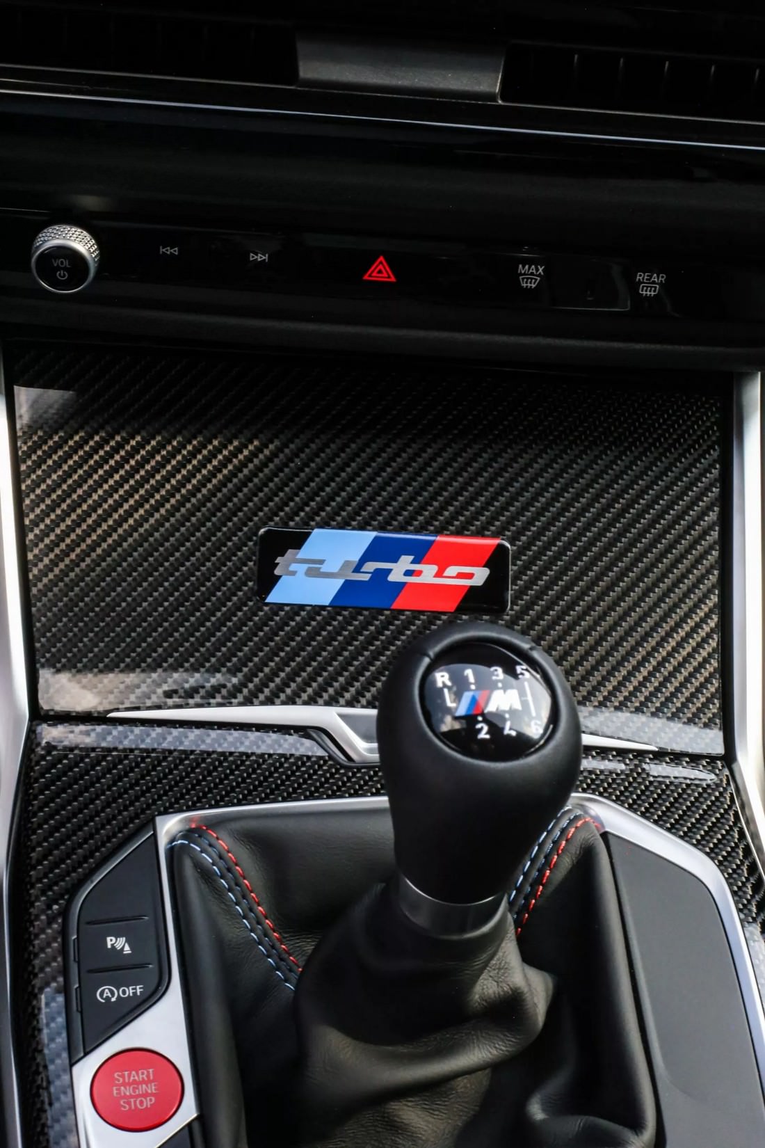 Visually, the new M2 Turbo Design Edition is a clear nod to the past. Every unit comes finished in Alpine White, just like the original 2002 Turbo, and features a carbon fiber roof that includes signature M-colored stripes running from front to back. While the carbon roof itself is already a $2,600 option on the standard M2, this version’s hand-painted detailing gives it a unique, artisanal touch. Additional M stripes adorn the hood and trunk, reinforcing its motorsport DNA. One particularly charming detail is the reversed “Turbo” script on the hood — a clever tribute to the original 2002 Turbo’s mirrored lettering that was meant to startle drivers in their rear-view mirrors. Though it doesn’t feature the classic side “hockey-stick” stripes of its ancestor, the design remains faithful to BMW’s 1970s performance aesthetic.
