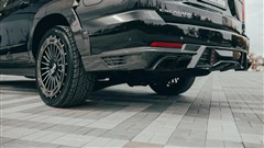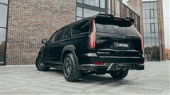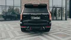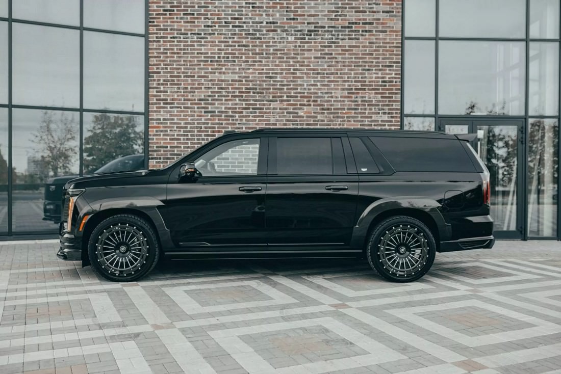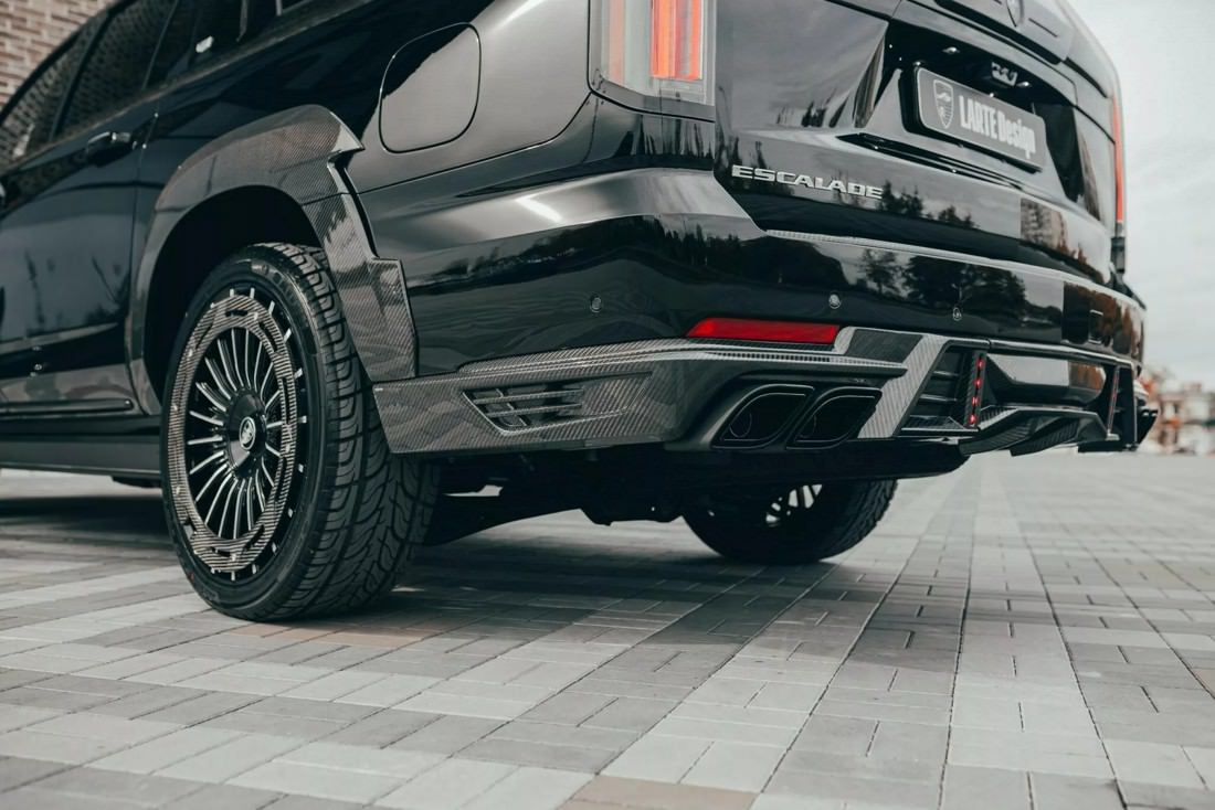 Along the sides, the transformation continues with flared wheel arches over both axles, giving the Escalade an even broader stance. Redesigned mirror caps complement the muscular fenders, while a bespoke set of forged alloy wheels adds sophistication and performance flair. These wheels are offered with a unique carbon fiber aero ring, further emphasizing the model’s blend of style and engineering precision.