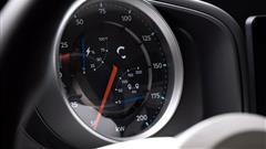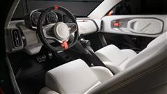 The instrument cluster consists of large analog gauges, complemented by a small touchscreen display for infotainment purposes. The minimalist center console houses touchscreen rotary dials, a push-button shifter, and a few other essential controls. Two compact cup holders and stainless steel pedals with rubberized accents complete the interior.