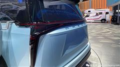 This car's style is more "down-to-earth," similar to the shape of the original production car. The air intake grille is closed since the front face is a pure electric type. Furthermore, the headlight party uses an exaggerated ratio style, which makes it visually impactful. I assume that the final mass-produced vehicle would minimize the size appropriately based on the characteristics. It's worth remembering that there's a hump on the front roof. It should be a lidar, indicating that this vehicle is capable of self-driving.
