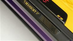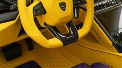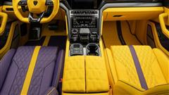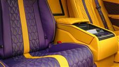 Inside the cabin, a lavish transformation awaits, reminiscent of the iconic colors of the Los Angeles Lakers. The driver's seat is upholstered in opulent purple leather with a striking yellow stripe, while the passenger seat features a reverse scheme with yellow leather and a purple strip. The opulence extends to the rear seats, harmonizing with the front ensemble. Mansory's attention to detail is evident in the meticulous application of yellow leather to the steering wheel, door panels, center console, and floor mats, accentuated by carbon fiber embellishments throughout.