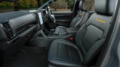 From a visual standpoint, the Tremor stands out with unique badging, a steel skid plate, cast aluminum side steps, and a sports bar on the bed. It rides on 17-inch Asphalt Black alloy wheels fitted with General Grabber AT3 all-terrain tires. The Australian version of the Tremor has a more refined appearance compared to its New Zealand counterpart, featuring LED headlights and a honeycomb grille. Inside, the Tremor boasts a distinct orange emblem on the seats, designed by Ford's interior team.