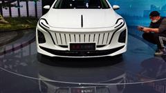 Hongqi E-QM5 features four leather-wrapped individual seats divided by wide center armrests, shiny black accents, carbon fiber-effect trim, and aluminum. A tablet-like interface sits on the dashboard, and it appears that it will be used to monitor the majority of the car's functions, as we can't see any physical buttons other than the ones on the three spoke steering wheel, the automatic parking brake and hazard lighting on the center console, and the ones used to operate the power seats and windows.