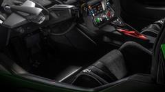 The carbon fiber chassis allowed the Lamborghini engineers to reduce the weight while the giant rear wing produces 1,200 kg of downforce at the speed of 250 kph.
