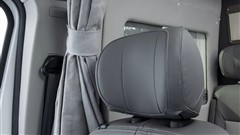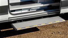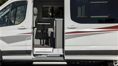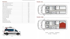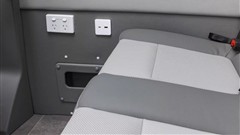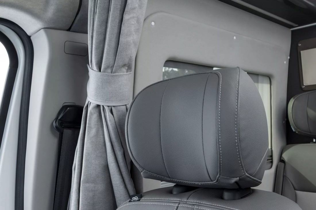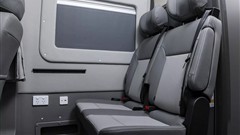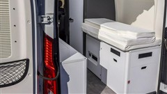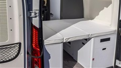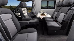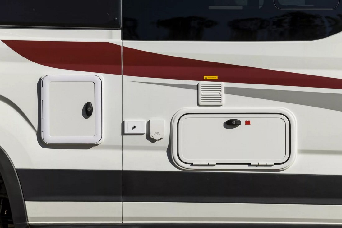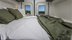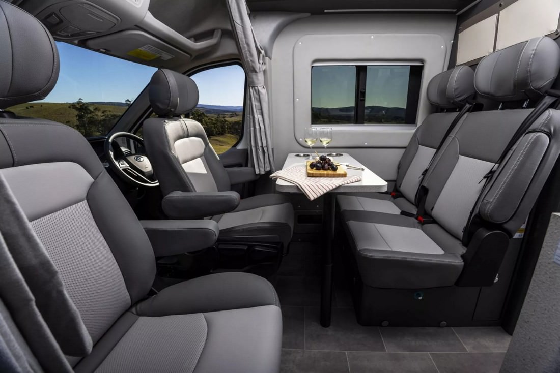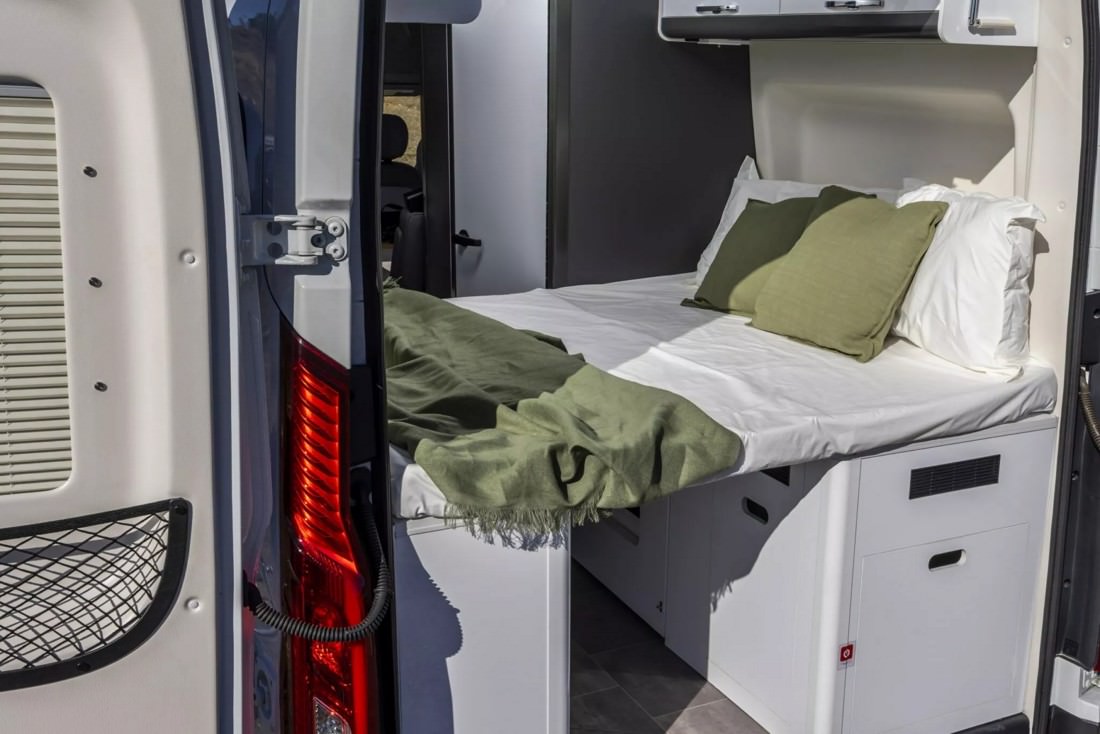 Toward the front of the cabin are two swiveling captain’s chairs and a stowable dining table, which together create a flexible social or eating area. A rear bench completes the main seating arrangement. At the very back of the van is a double bed that can be easily assembled or taken down within a minute, allowing full access to the rear cargo doors when not in use. The layout is optimized for two occupants, though a very small third sleeper might manage on the front bench. To power the interior appliances, the campervan comes with a 2.56 kWh lithium-ion auxiliary battery and a 190-watt solar panel mounted on the roof. Water is stored in three separate tanks: a 100-liter freshwater tank, a 100-liter greywater tank, and a 16-liter waste tank.
