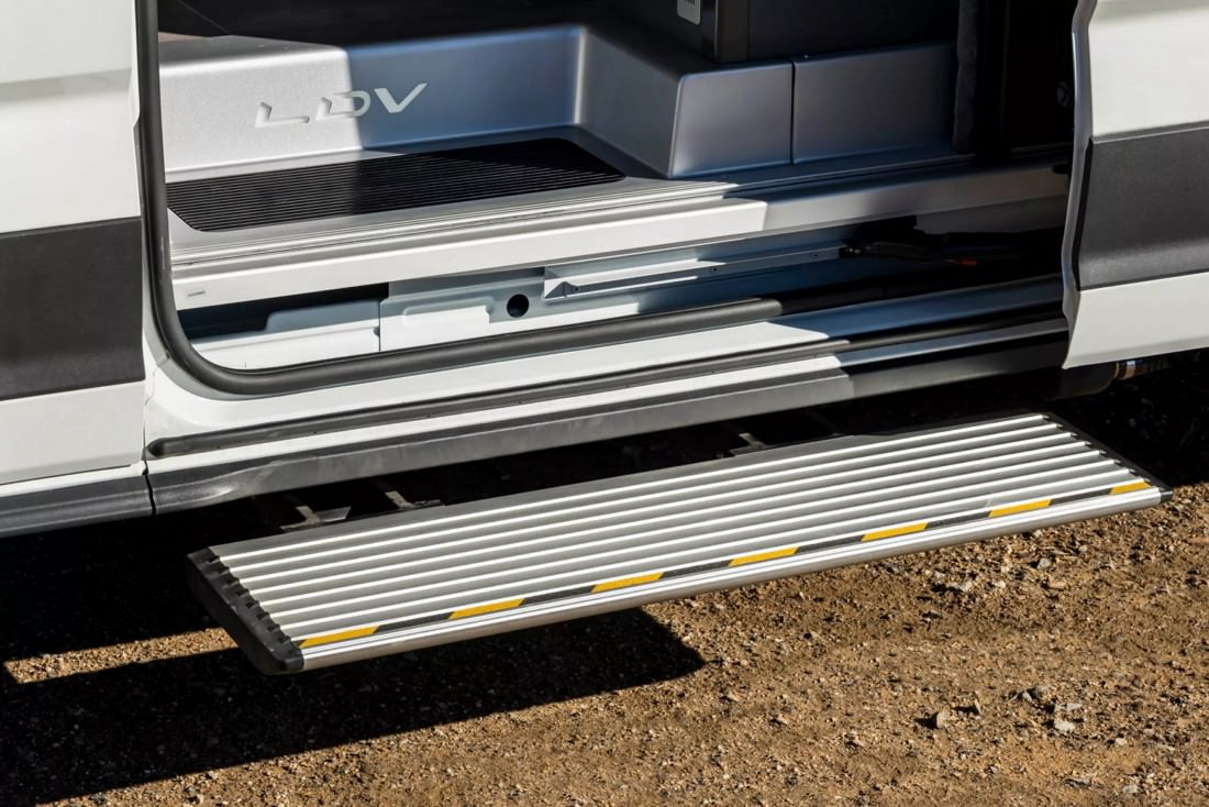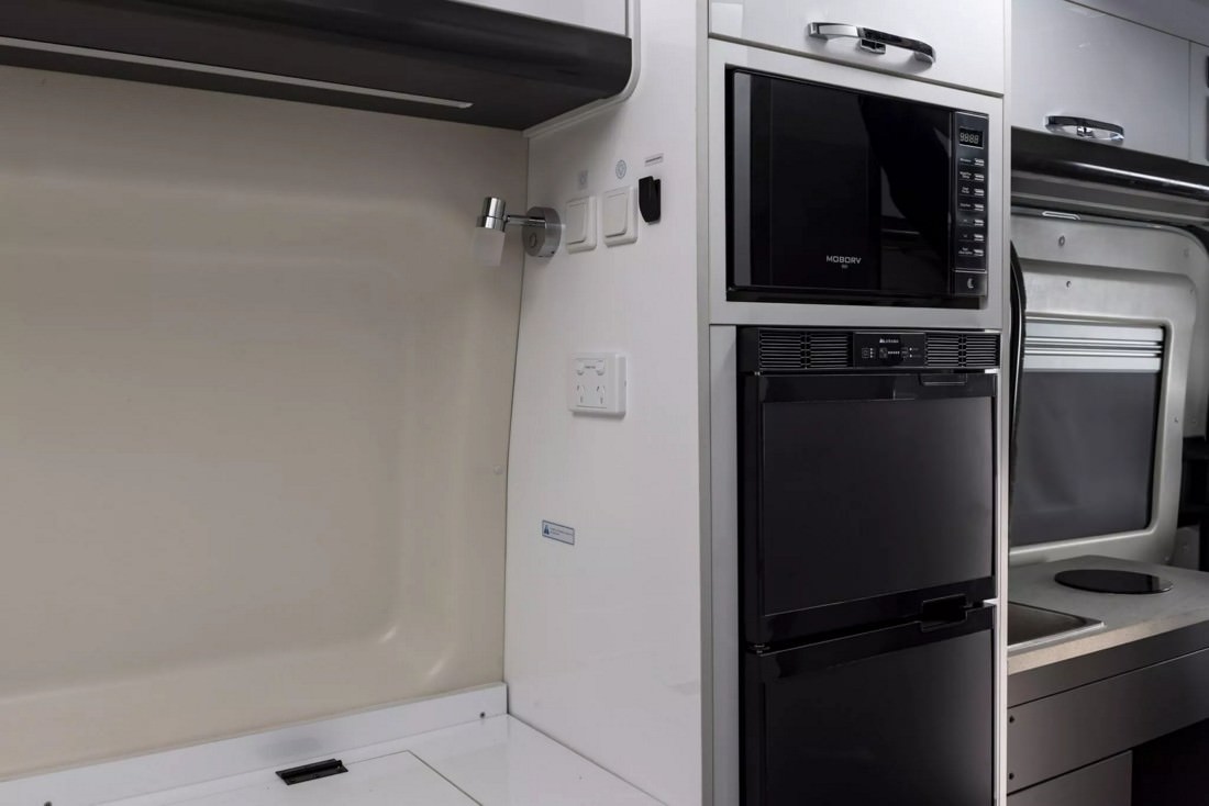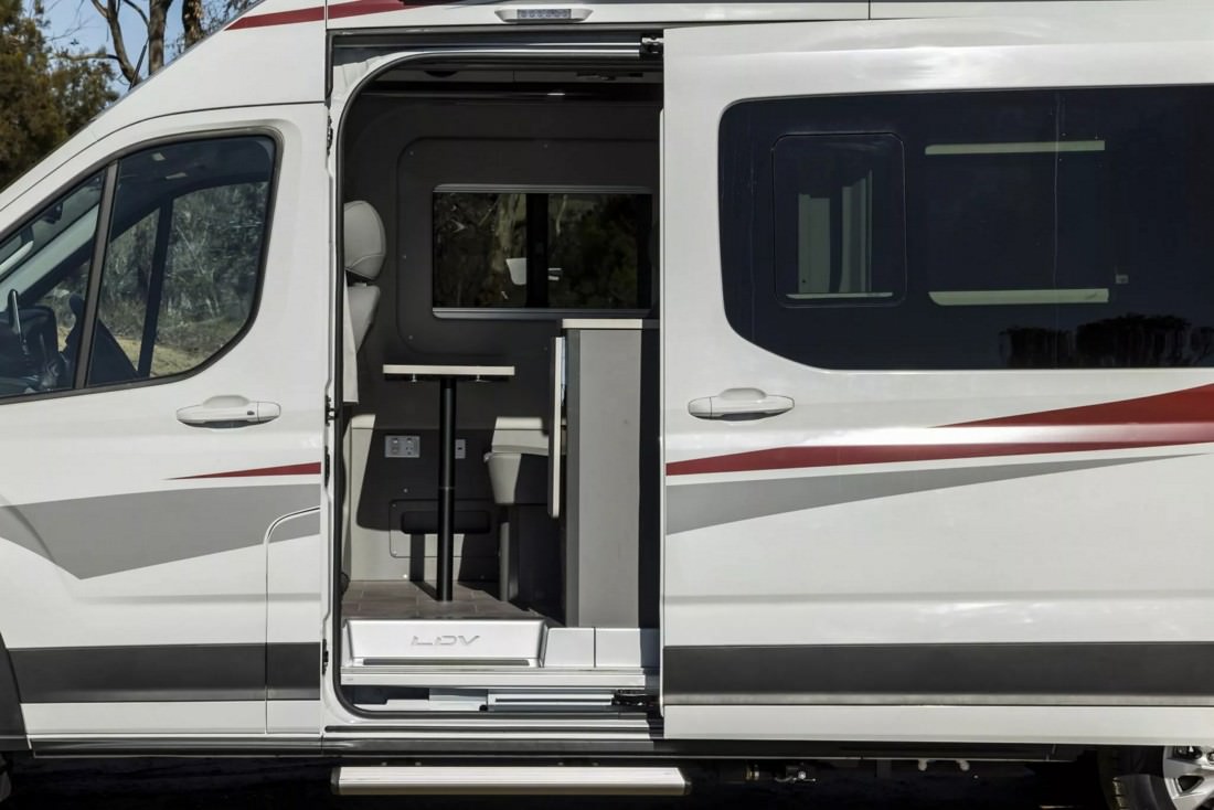 Stepping inside is easy, thanks to an electronically controlled side step. The sliding door is accompanied by a fly-screen cover, providing ventilation while keeping insects out. Once inside, occupants are greeted by an interior layout that resembles a compact apartment. The kitchen occupies one side and comes equipped with a stainless-steel sink, a refrigerator, a freezer, a microwave oven, and an induction cooktop—everything needed for cooking on the go. A nearby door leads to a self-contained bathroom, which includes an indoor shower. For travelers who enjoy outdoor rinses after a swim or hike, LDV has also added an external shower attachment.