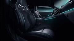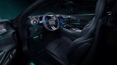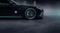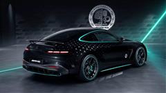 The special edition boasts a striking exterior with Obsidian Black metallic paint, hand-painted stars, and bright aquamarine stripes. These accents are prominently displayed on the side window graphics, sills, wheel rims, front bumper air intakes, and brake calipers. The interior also reflects the F1 theme with illuminated door sills, ambient lighting, and sports seats finished in Nappa leather and microfiber cloth.