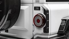 From the outside, Mansory's Grenadier is instantly recognizable by its extensive use of carbon fiber accents. A new front splitter, grille, and hood bulge, all adorned with the Mansory emblem, create a more aggressive and imposing appearance. The wide fender extensions and rear bumper also feature carbon fiber elements, complete with integrated vents for enhanced aerodynamics. To further accentuate the vehicle's off-road prowess, Mansory has added aerodynamic roof add-ons and an array of extra LEDs. The Grenadier's stock white exterior now contrasts sharply with these dark accents, creating a visually striking effect. Completing the exterior transformation are new 20-inch FV.9 alloy wheels wrapped in high-performance tires, providing improved grip and traction.