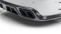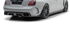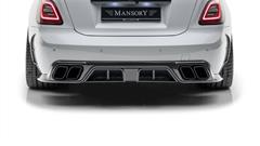 Mansory's newest Rolls-Royce Ghost is outfitted with a one-of-a-kind body kit that incorporates a carbon fiber hood. A carbon fiber front splitter, unique front and back bumpers, carbon fiber side skirts, a tiny spoiler stretching at the top of the rear window, a secondary spoiler on the trunk lid, and a distinctive diffuser round out the body kit. The Rolls-Royce also boasts high-gloss black wheels and distinctive tailpipes. In this example, Mansory has also installed an illuminated grille on the Ghost.
