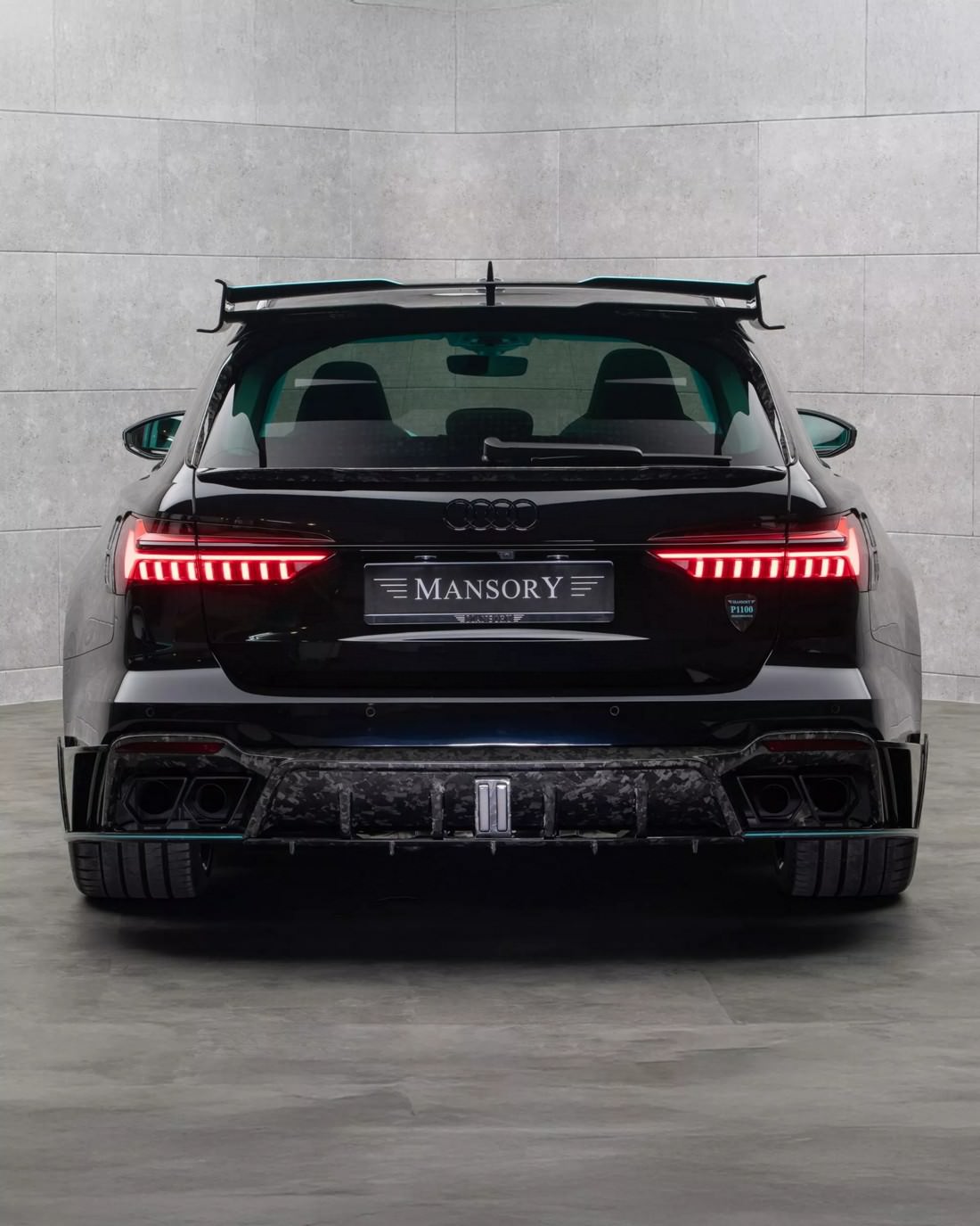Aerodynamics play a central role in this transformation. Up front, a large and sharply sculpted splitter dominates the nose, complemented by fins and canards that add a motorsport-inspired edge. The grille has been further embellished, while the hood now features prominent vents that reinforce the car’s performance-focused character. Along the sides, redesigned skirts, oversized side gills, and carbon-fiber mirror caps add visual tension and width. At the rear, the RS6 is anchored by an imposing diffuser that integrates Formula 1-style brake lights and a quartet of substantial exhaust outlets. A larger roof-mounted rear wing sits above the existing spoiler, providing an even more aggressive profile. Completing the exterior are massive 22-inch Mansory YN.5 forged wheels, finished in black and featuring a distinctive five double-spoke design.