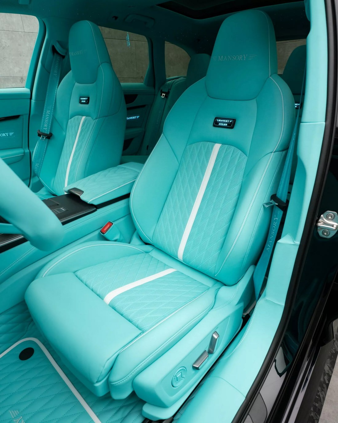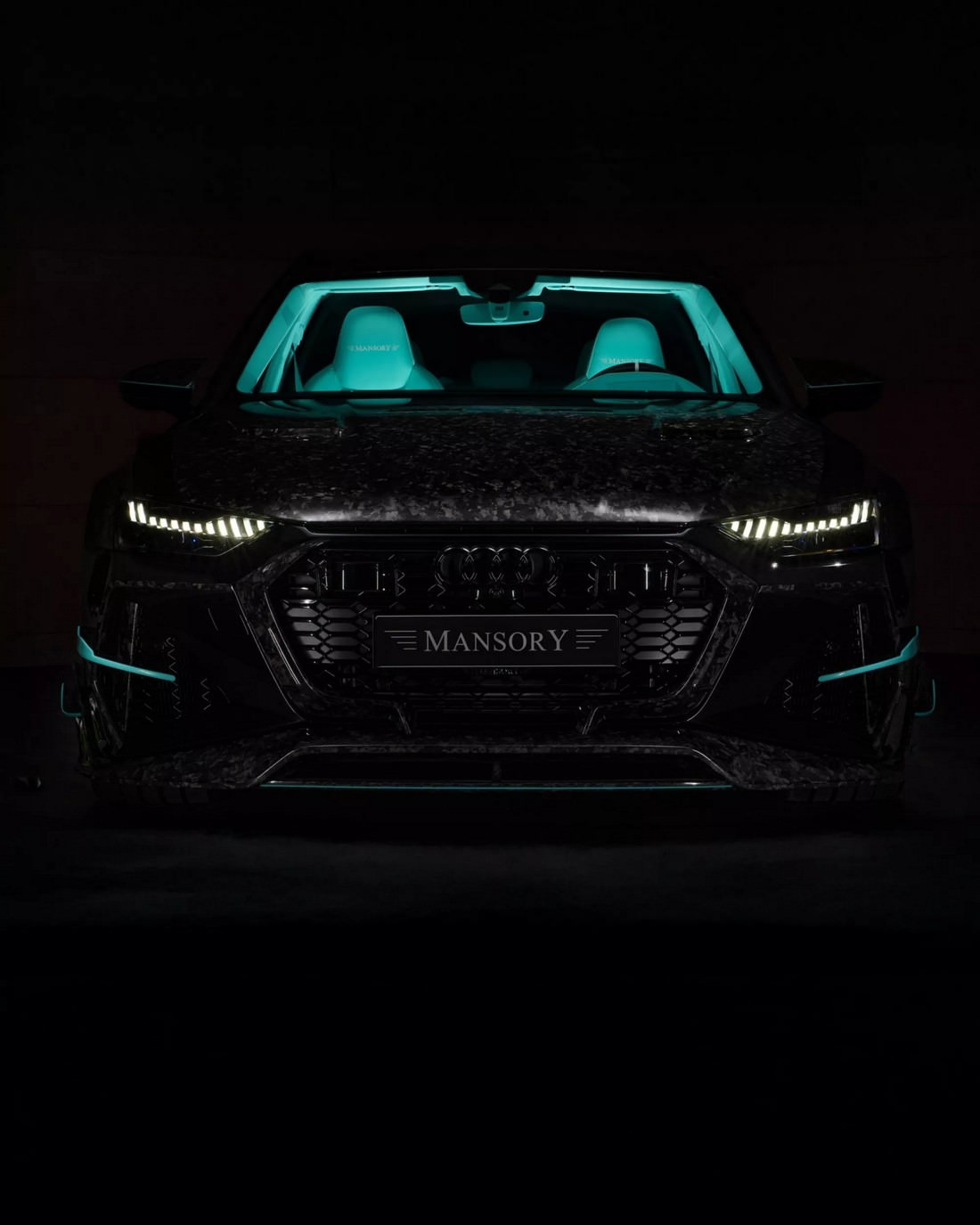 Inside, Mansory has taken its signature boldness to an extreme. The cabin is drenched almost entirely in turquoise, creating a dramatic contrast to the car’s dark exterior. Quilted leather seats, door panels, carpets, dashboard surfaces, seat belts, and even the headliner are all wrapped in the same vivid hue. A starlight-style roof liner adds an extra layer of visual drama, while illuminated Mansory logos are scattered throughout the interior. Carbon-fiber trim elements help balance the intensity, but overall, the atmosphere feels less like a standard Audi and more like a bespoke luxury show car, reminiscent of the most extravagant creations from rival tuners such as Brabus.