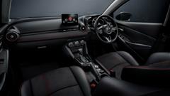 The inside of the Evolve and GT models is all-black with red accents on the seat backs and air vent covers. The Mazda2 GT also has multi-spoke wheels with an aerodynamic design, polished twin exhaust tips, red and black interior trim, and half-leather seats.