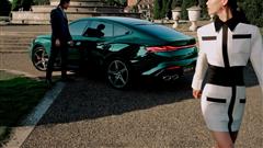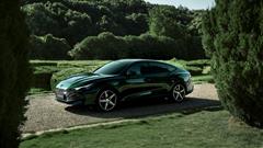 Full-width LED taillights, a rear windscreen with a steep inclination, an integrated ducktail spoiler, and quad exhaust pipes are all present at the rear.