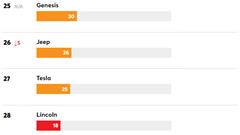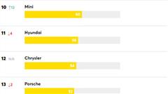 Let's return to the list, where Lexus is ranked first with a score of 76. This put it ahead of Mazda (75 points), Toyota (71 points), and Infiniti (69 points). The same 66 points were awarded to Buick, Honda, and Subaru.
