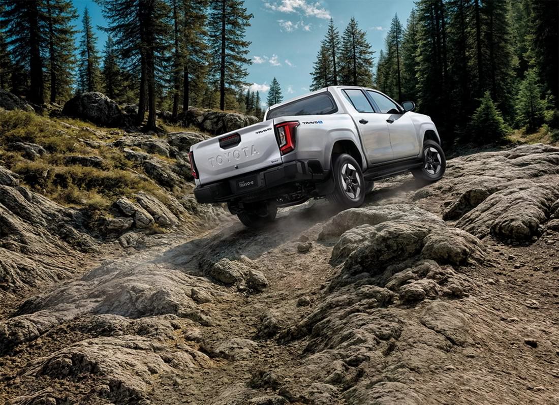 Payload and towing remain strong for combustion models at 1,000 kg and 3,500 kg, while the electric Hilux carries 715 kg and tows 1,600 kg. Off-road capability is enhanced with a part-time 4WD system, high/low range ratios, a rear locking differential, and the optional Multi-Terrain Select system.