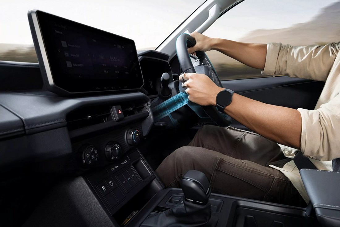 Inside, the Hilux cabin has undergone a major transformation, merging modern technology with its utilitarian heritage. A boxy dashboard houses a free-standing 12.3-inch infotainment screen and a matching 12.3-inch digital instrument cluster. Key functions such as climate control and audio retain physical buttons for ease of use. The steering wheel, borrowed from the Land Cruiser, features integrated buttons, while the center console accommodates a compact gear knob and drive mode selector. Dual storage compartments on the passenger side and dashboard-mounted cupholders complete the interior layout. Toyota has also enhanced the Hilux’s safety suite with a “significantly extended” range of advanced driver-assistance systems, bringing it closer to passenger car standards.
