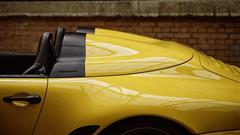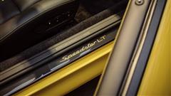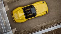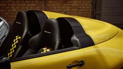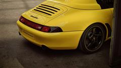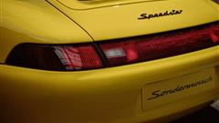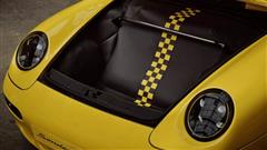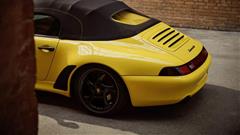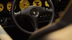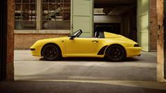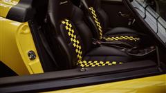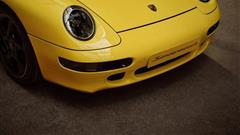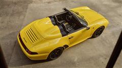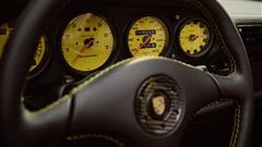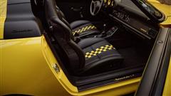 Trazzi played a significant role in designing this special vehicle, working closely with the Porsche Sonderwunsch team. The custom creation is based on a 993 Carrera Cabriolet and features distinctive modifications that set it apart. These modifications include a uniquely shortened windshield and a redesigned rear decklid. Aesthetic details such as black 18-inch Turbo twist wheels with body-colored pinstriping, retro-styled mirrors, and a yellow-and-black checkered-flag trim on the seats contribute to its unique look. Additionally, the headlights incorporate a four-dot running light design reminiscent of modern Porsche models, and the car’s vibrant yellow color is named in honor of Trazzi's dog, Otto.