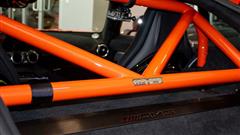 Machine Black wheels with distinct orange highlights were installed by the tuner. Additional improvements include a rollbar that matches the color of the vehicle, four-point seatbelts from Sabelt or Schroth, and a fire extinguisher, features that are identical to those included as factory options on the EU-spec model.