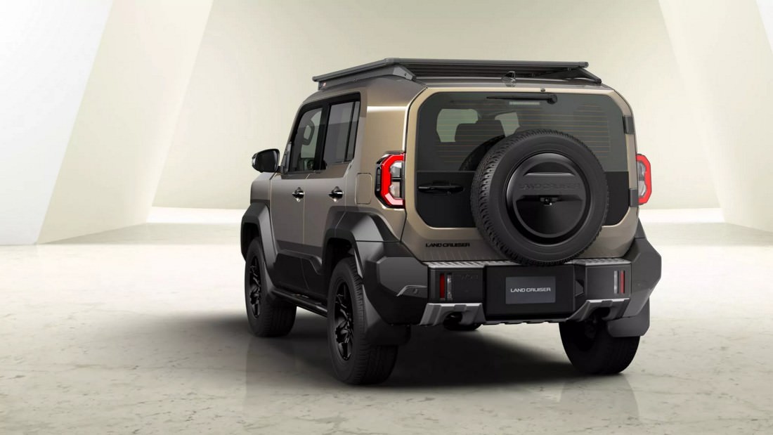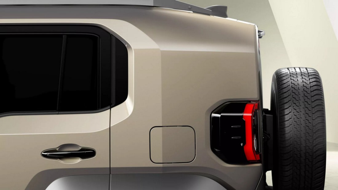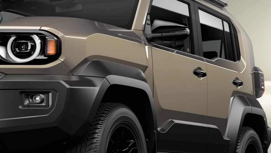 From the side, the Land Cruiser FJ showcases chunky, angular fender flares and thick body cladding, giving it a muscular stance. The bodywork includes a massive rear pillar that contributes to its bold proportions, though it may reduce rear visibility. At the back, a tailgate-mounted spare tire dominates the design, paired with C-shaped taillights and a rugged bumper, completing the robust aesthetic.