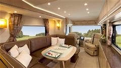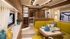 Inside, it has a high-end Burmester radio, a power-rising storage space for plates and cups, a shower, white upholstery throughout the cabin, and hand-applied BrilliantBlack wood veneer.