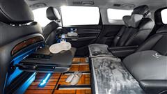 The standard equipment list includes soft leather and fabric upholstery, ergonomic seats on the first and second rows, double-layer soundproof glass, and extensive use of soundproofing materials.