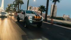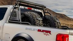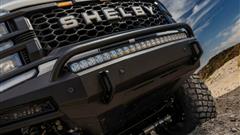 The vehicle also features a Shelby-branded grille, painted fender flares, and powerful bumpers. Power side steps, an extraction vent-equipped air induction hood, and auxiliary lights connect them. Stripes, a bed liner, and a chase rack with two spare tires complete the features.